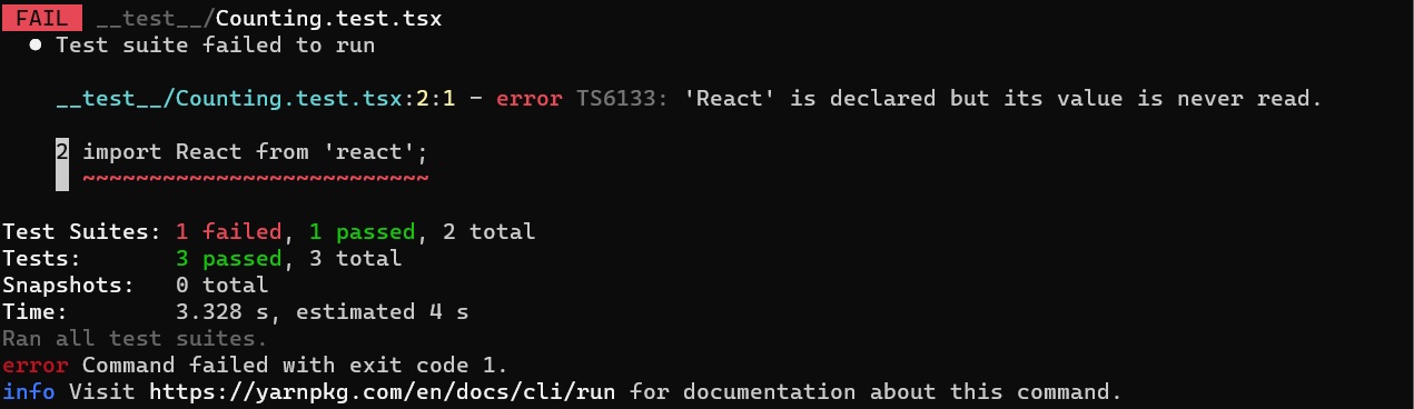 - 위의 코드를 작성한 후에 ' yarn test ' 명령어를 치면 에러를 하나를 만날 수 있을것이다.