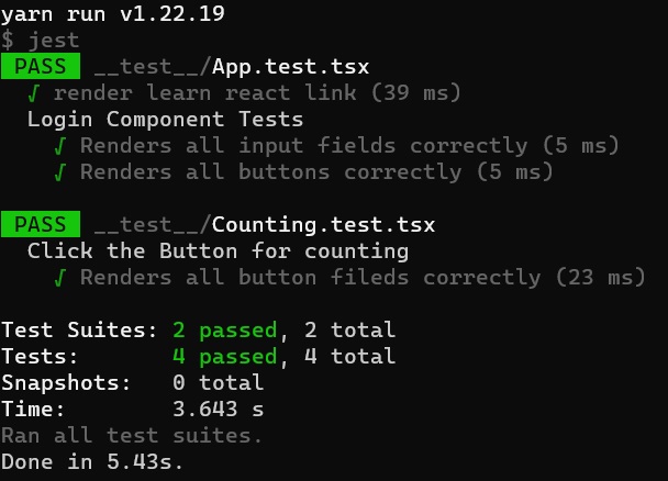 - App.test.tsx 파일이 아닌 Counting.test.tsx 파일을 만들어주고, src 밑에도 Counting.tsx란 파일을 생성해주고 코드를 작성해주었다.